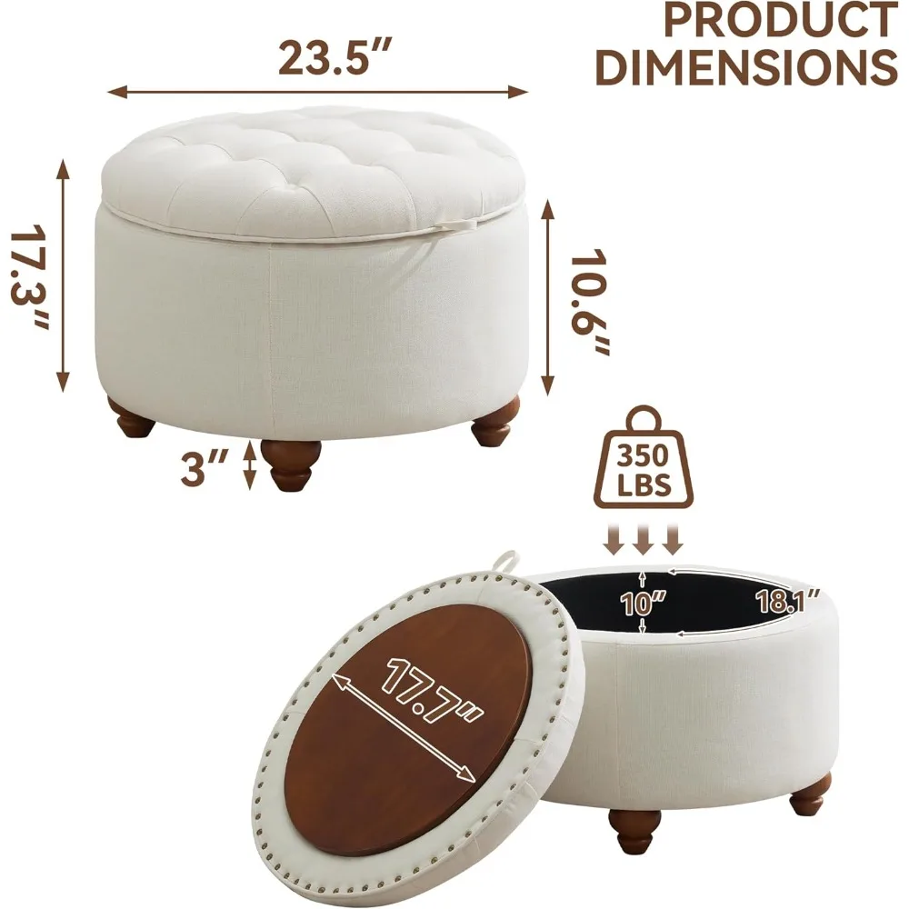 Meet a stylish, multi‑functional centerpiece designed to declutter and elevate your living space. This 24‑inch round storage ottoman blends soft beige linen fabric with a durable rubberwood frame for a timeless look that works in living rooms, bedrooms, or entryways.