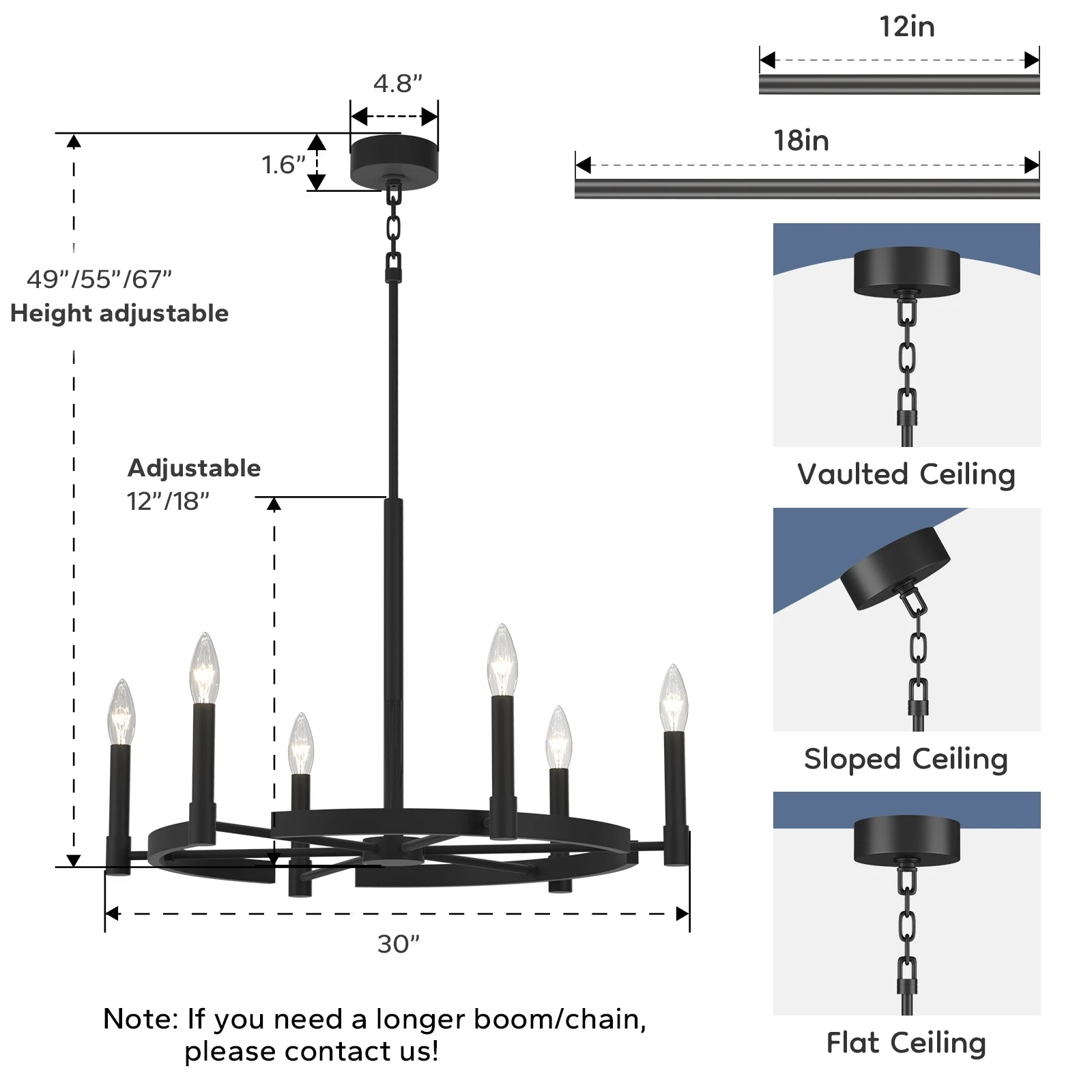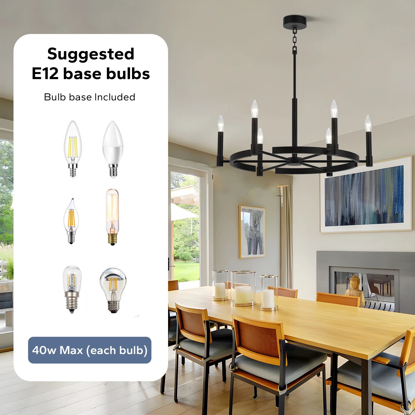 30In Wagon Wheel Chandelier 6 Light Industrial Farmhouse Iron Pendant E12 Base delivers bold, modern farmhouse charm with an industrial edge. Crafted from sturdy metal, this wagon wheel chandelier features a durable matte black finish that resists rust and fading, keeping its striking look for years.
