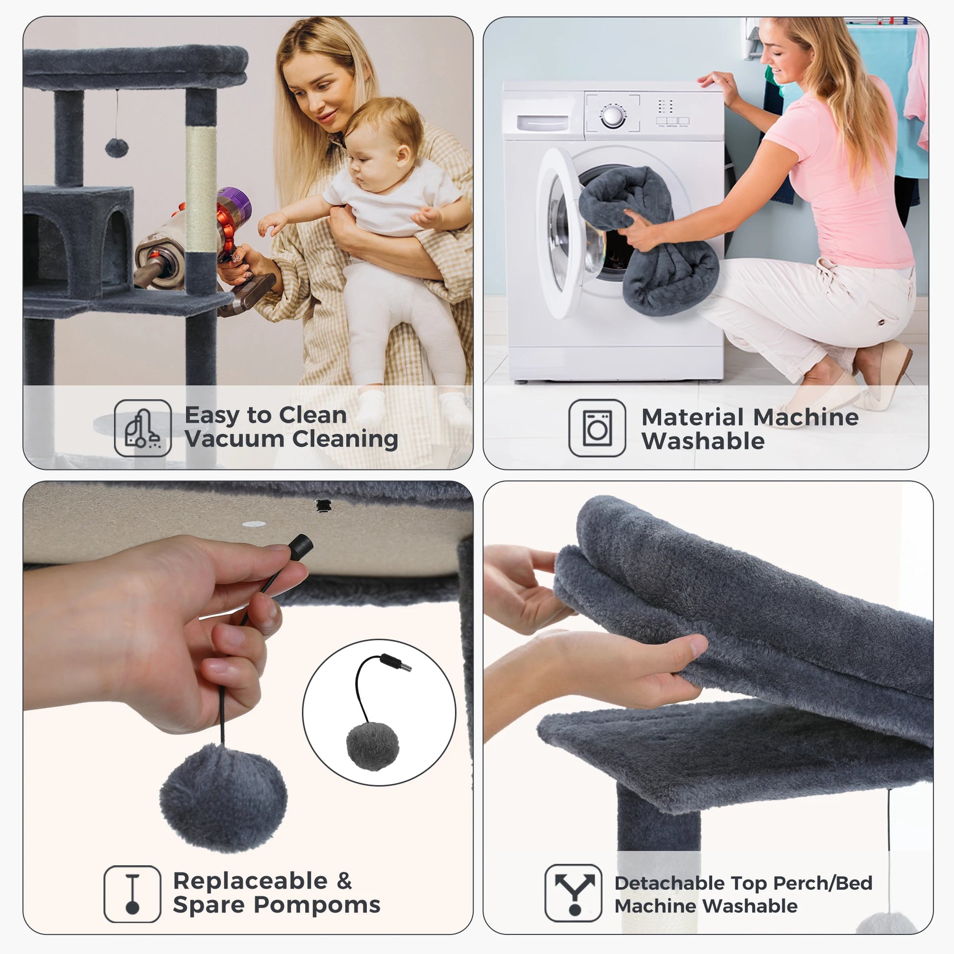 - Ultimate Activity House: roomy condo, spacious 20" x 17.7" hammock, cozy plush top perch, natural sisal wrapped posts, and a playful fuzzy dangling ball. A 56.3'' tall cat tree that doubles as an entertainment hub and a restful retreat.