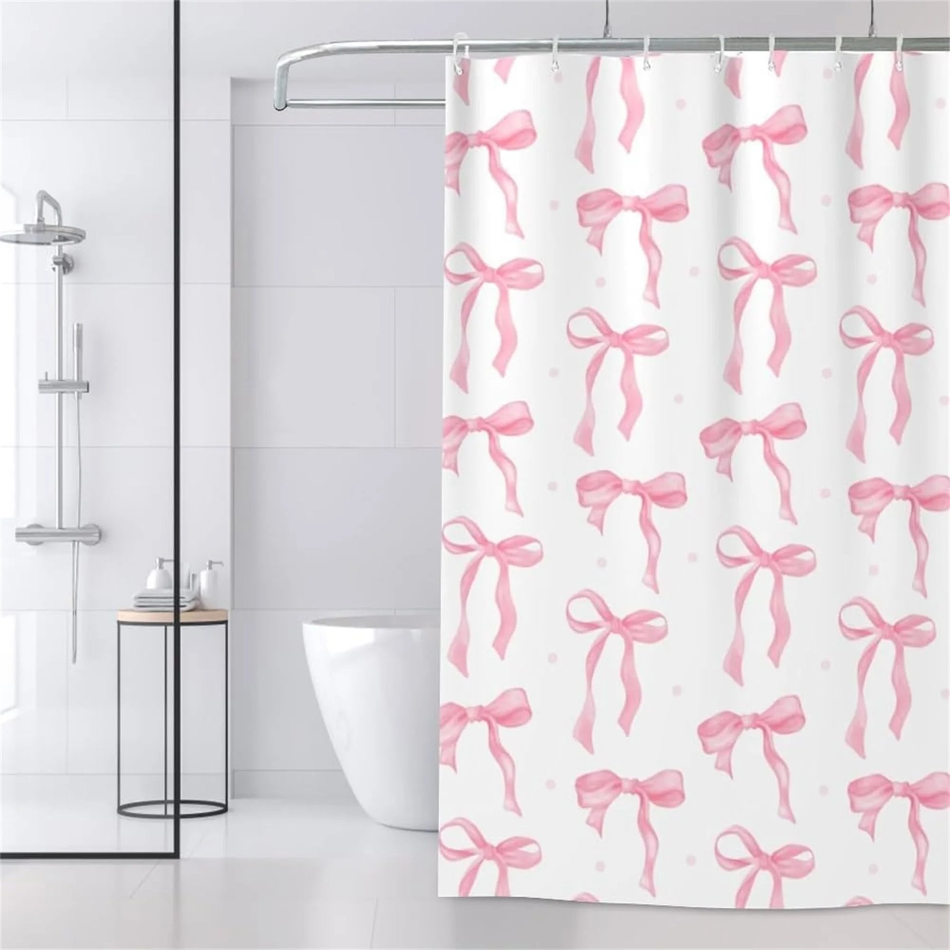 - Bold pink color with a bow pattern adds a playful, contemporary touch to bathroom decor.