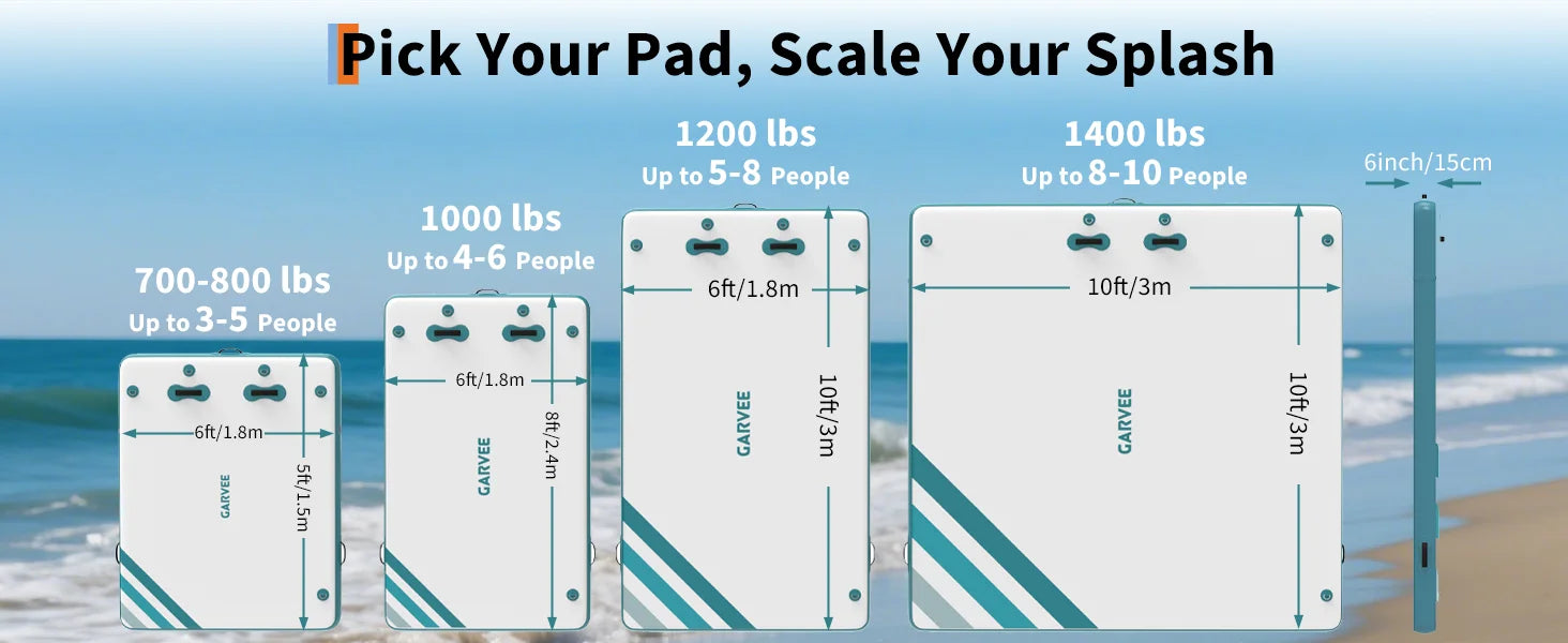 Inflatable Floating Dock Swim Platform for Lakes and Beaches Adults — the ultimate floating resort for lakeside fun. This versatile inflatable dock comes in three spacious sizes (6 ft × 5 ft × 0.5 ft; 8 ft × 6 ft × 0.5 ft; 10 ft × 6 ft × 0.5 ft) to accommodate groups from 3 to 8 people, plus coolers, chairs, and umbrellas for hours of swimming, lounging, snorkeling, yoga, and sun-soaked relaxation.
