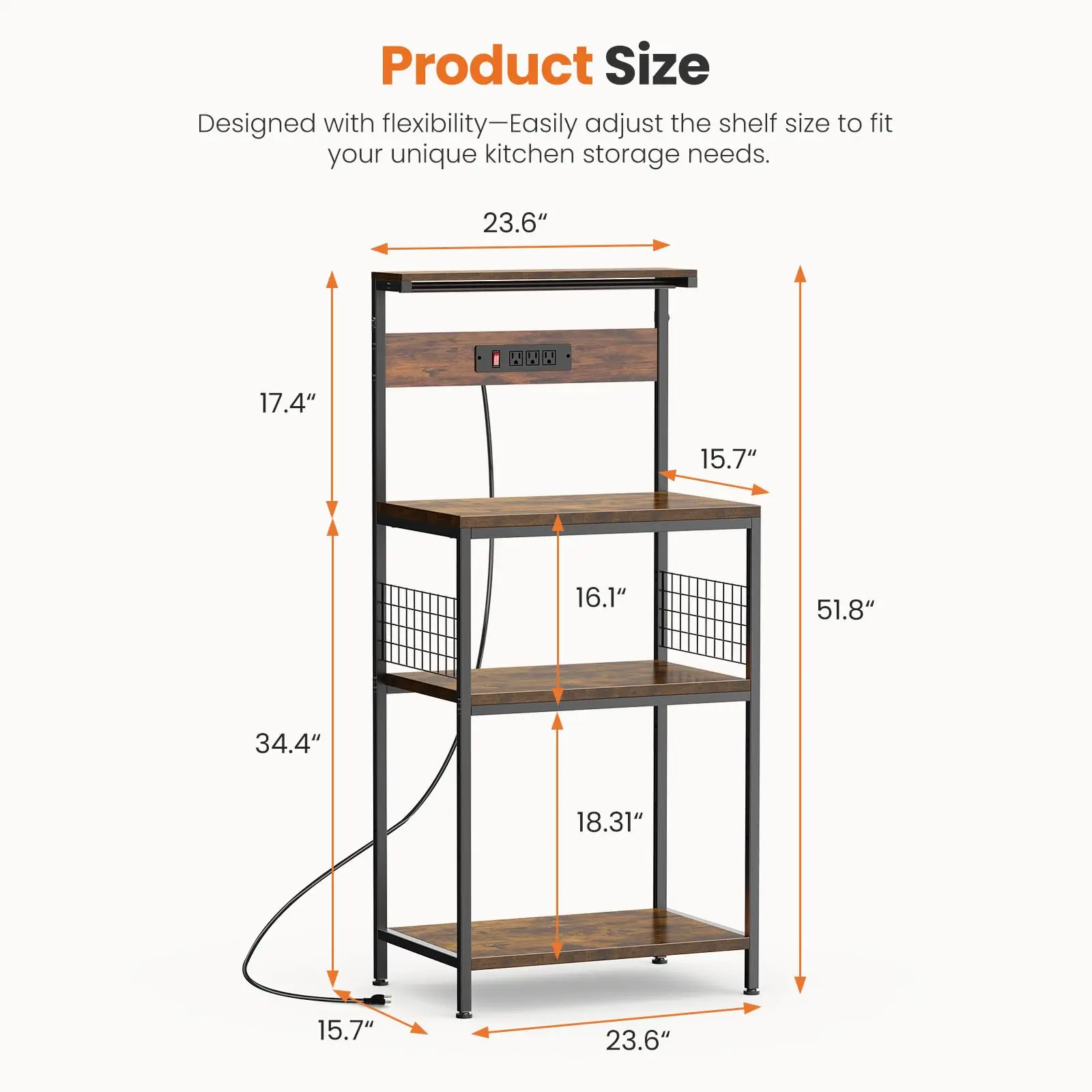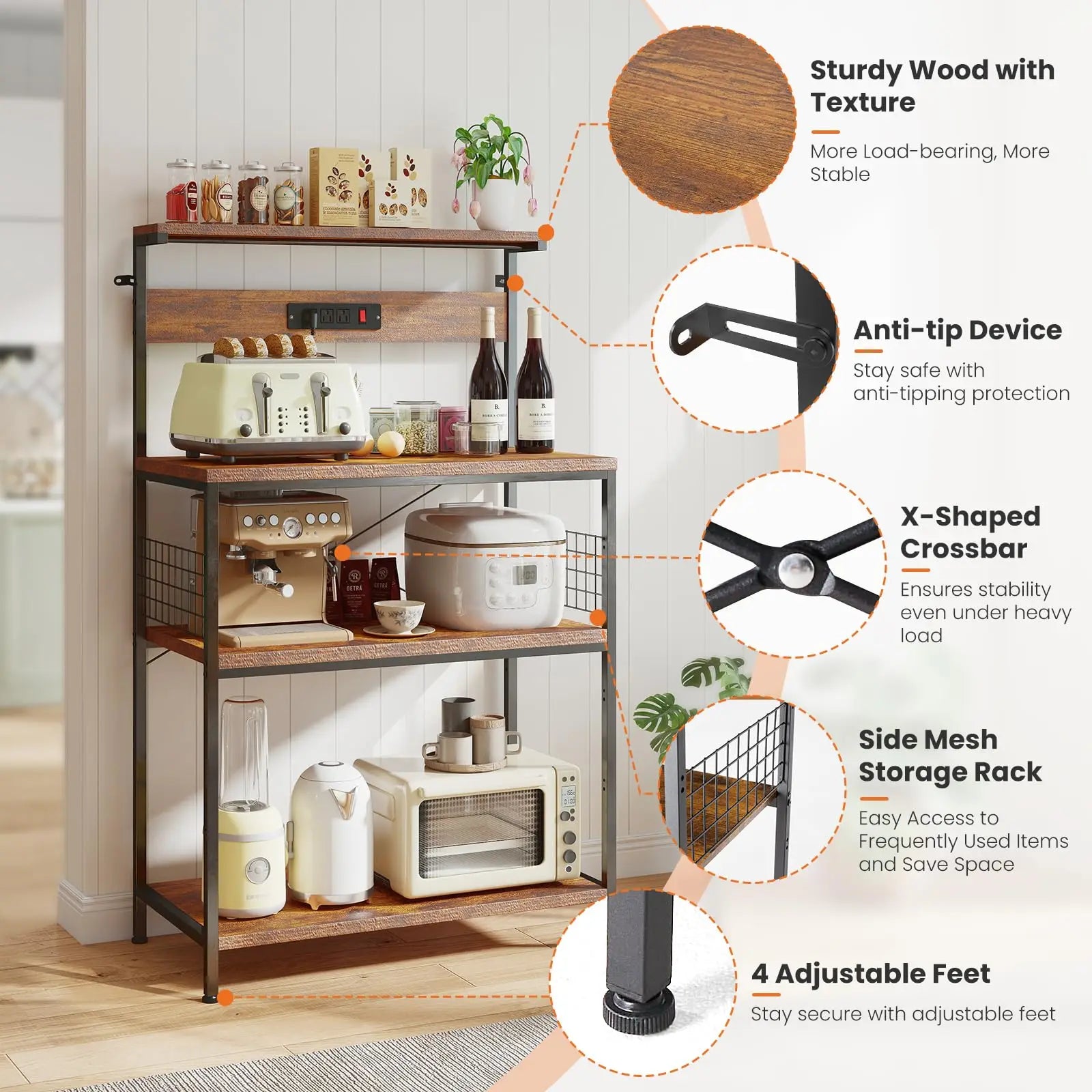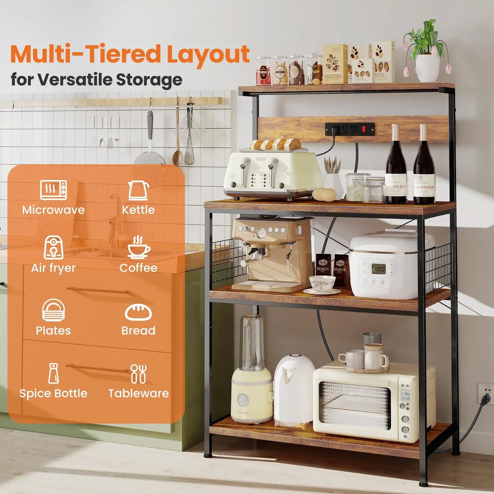 Say goodbye to tangled cords and cluttered counters. This baker’s rack features 3 built-in outlets and a convenient switch button, letting you power your coffee maker, toaster, air fryer, or other small appliances exactly where you use them. It centralizes power so you can prep, cook, and snack with fewer trips to outlets and fewer extension cords in sight.