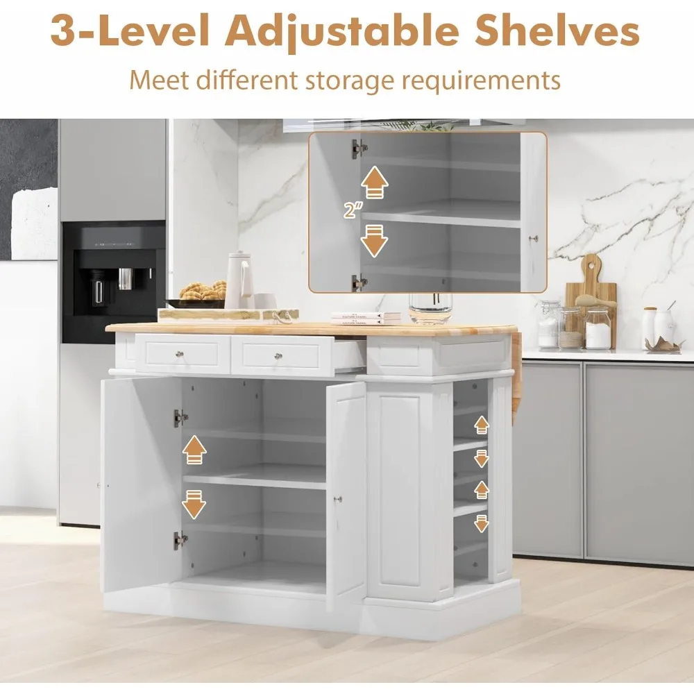 Kitchen Island With Drop Leaf Rubber Wood Top Storage Cabinet With 2 Drawers combines modern white aesthetics with serious, practical versatility. Designed for busy kitchens, open-plan living spaces, and home bars, this island adds instant counter space, organized storage, and a touch of refined craftsmanship to any room.
