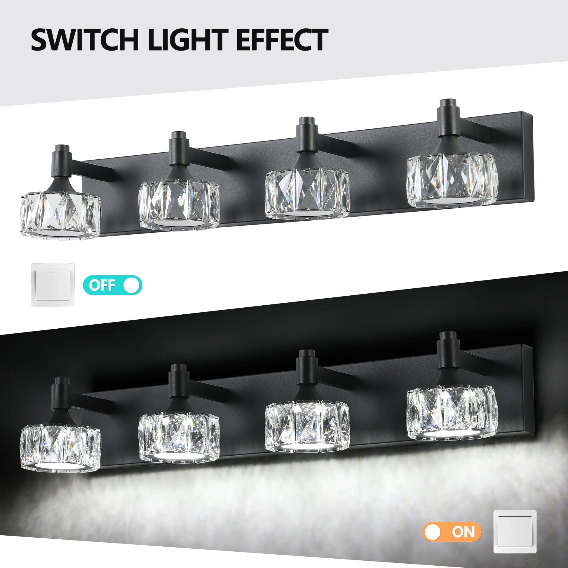 Elevate your bathroom, dressing area, or powder room with the LED Vanity Light 4 Light Matte Black Fixture With Crystal Glass Shades. This modern wall-mounted fixture blends a sleek matte black finish with crystal glass shades to deliver a touch of luxury and daily practicality.