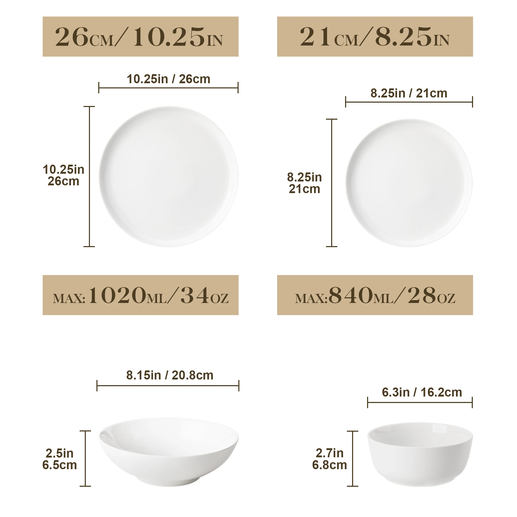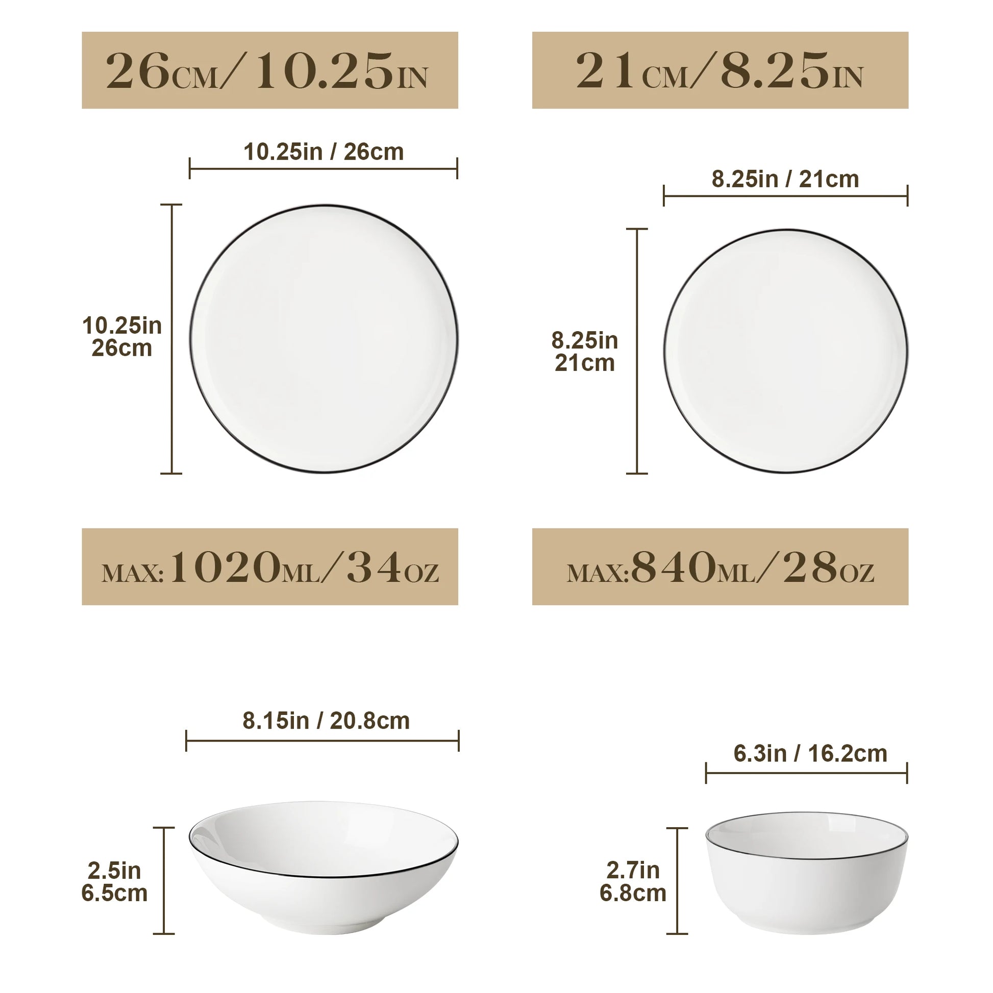 - 16 Piece: 4 Dinner Plates, 4 Dessert Plates, 4 Bowls, 4 Soup Plates