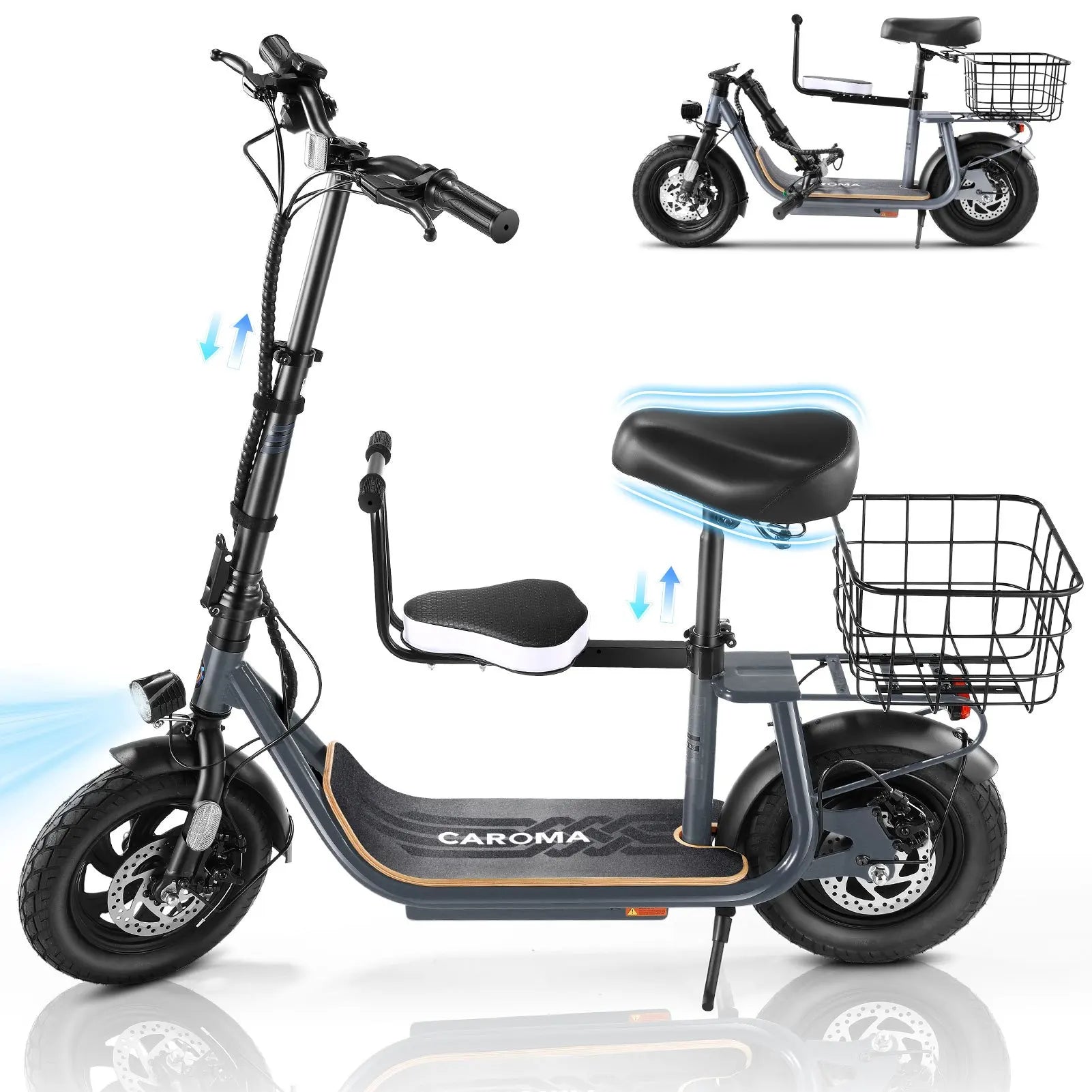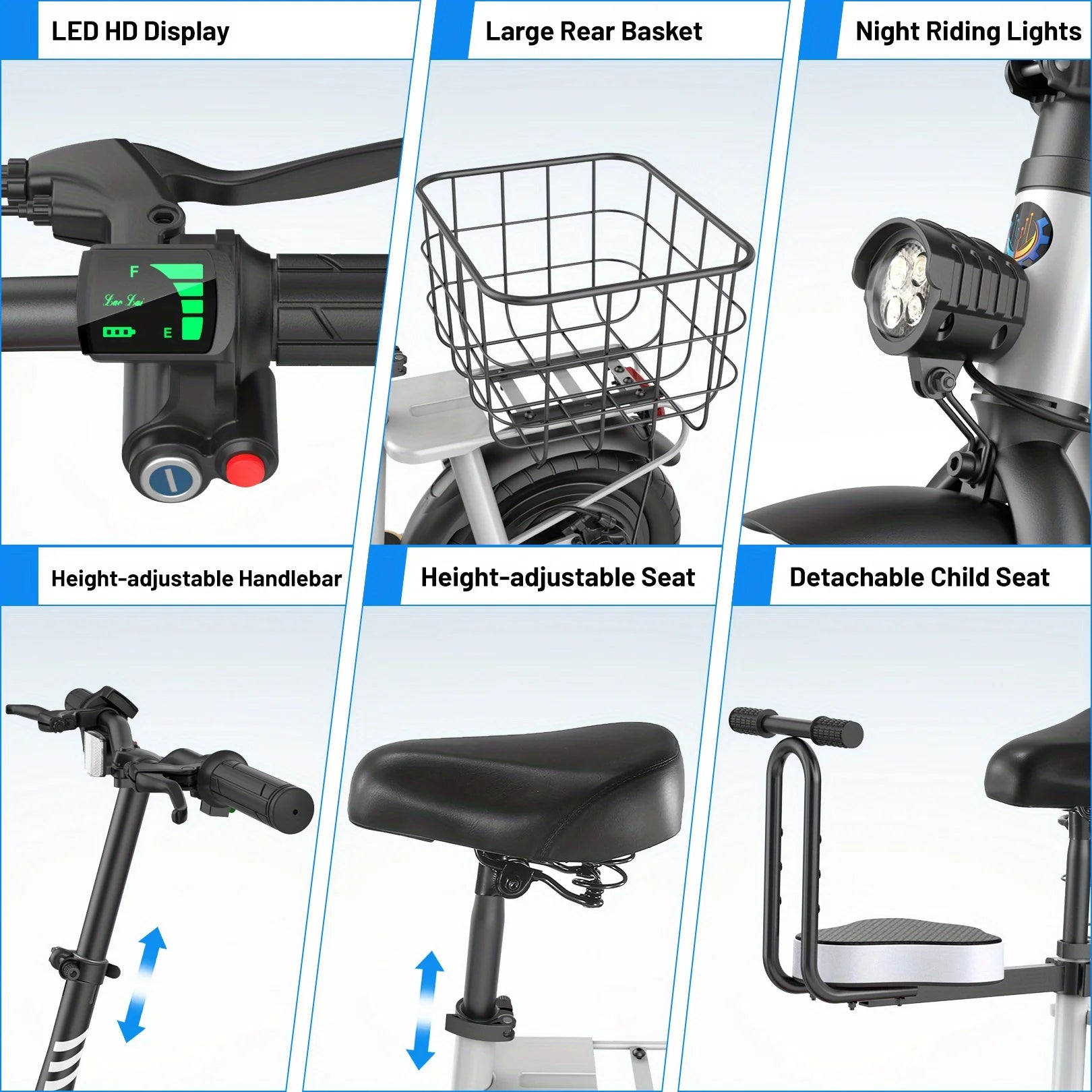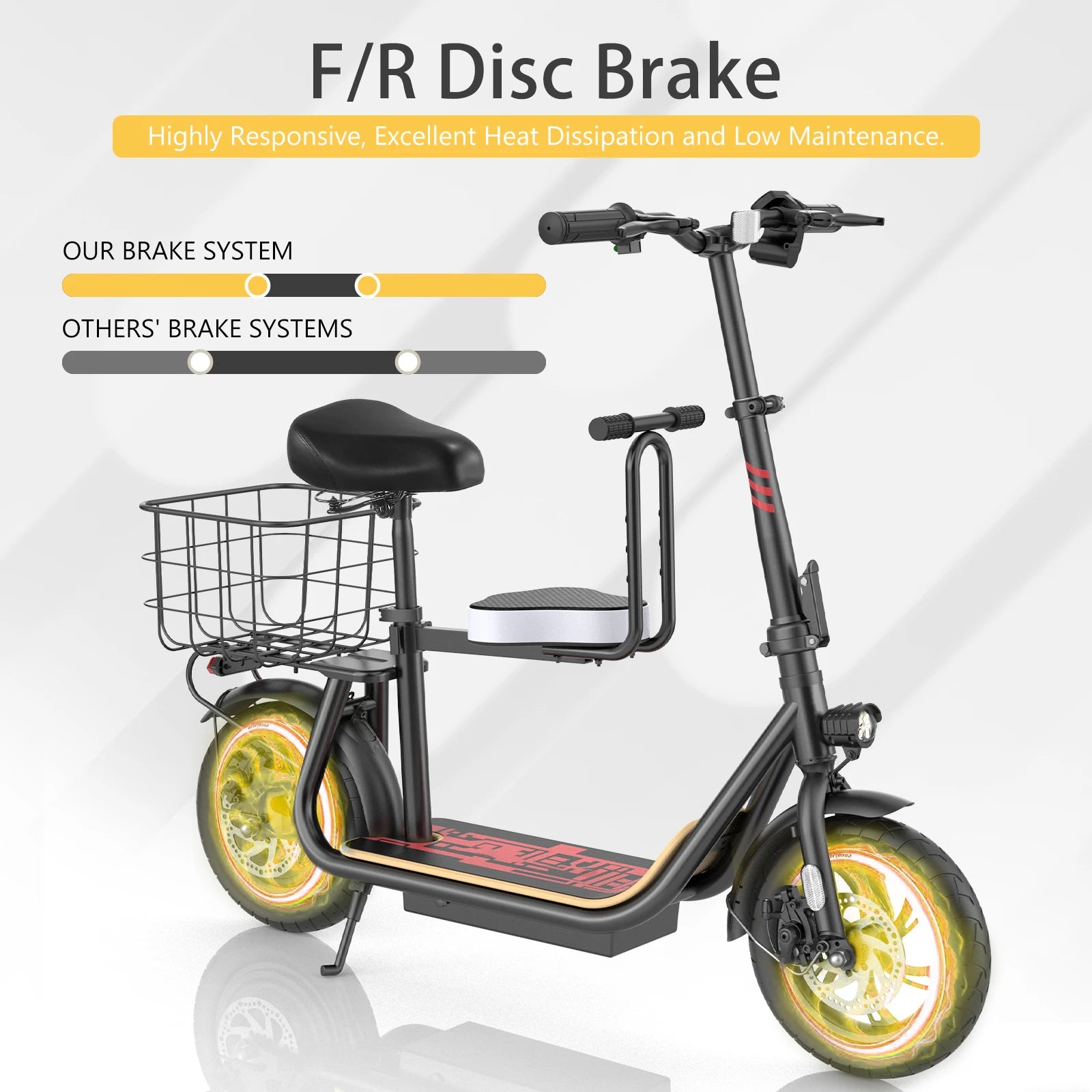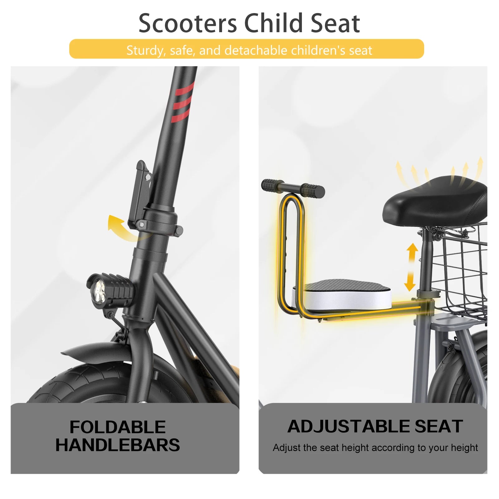 Detachable child seat for versatile use — Easily install or remove the kids seat to switch between carrying children, pets, or cargo. The 8.3-inch wide deck provides ample foot space and stability for riders of different heights, while the added rear basket increases cargo capacity on demand.