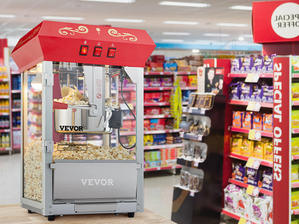 Durable Structure, Effortless Cleaning: This countertop popcorn machine comprises a cold rolled steel frame and tempered glass panels to withstand frequent use. The doors with magnetic latch provides quick access and enhances the appearance of the popcorn inside. The printed graphics on its top may also catch some hungry stares. Besides, the wing nuts on the kettle allow you to detach its lid easily and clean its interior thoroughly. Hassle-free cleaning will extend the machine's service life.