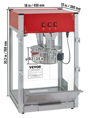 Create bucket after bucket of fresh popcorn for your customers with this 8/12 Oz commercial popcorn machine. It pops up to 384/640 oz of popcorn per hour. Now that is a lot of popcorn. It is sure to be a great investment for turning a quick and easy profit. The built-in light and simple operation allow it to attract hungry customers and will consistently perform at its best during the busiest hours. Don't miss this excellent addition to state fairs, carnivals, sporting events, fundraising events, and other high-volume applications!