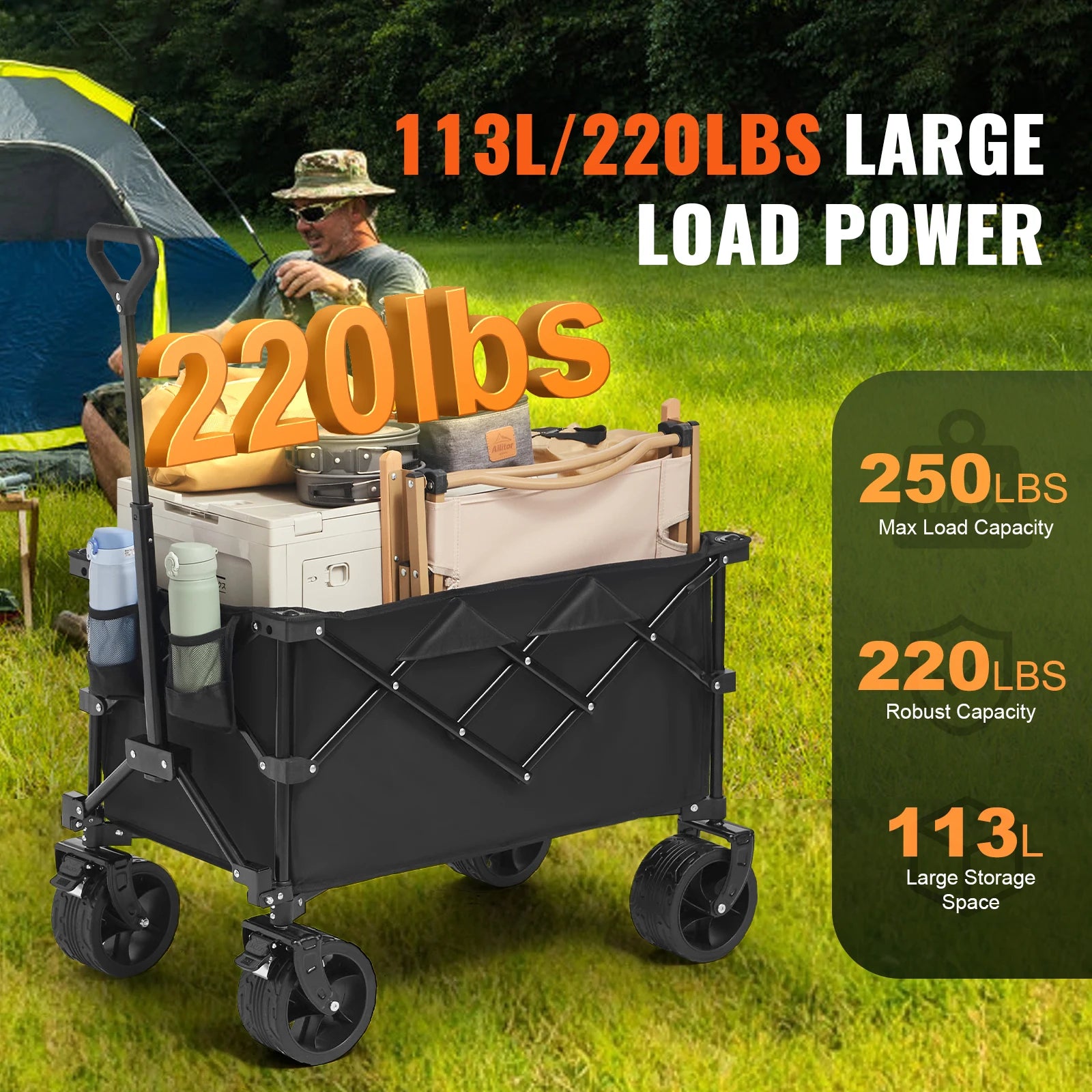 The wagon’s standout design starts with a reinforced iron frame finished in durable powder coating, delivering exceptional rust resistance and long-term reliability. Paired with 600D Oxford fabric that’s PVC-coated, it stands up to the elements, making cleanup quick and easy after muddy hikes or sandy beach trips.