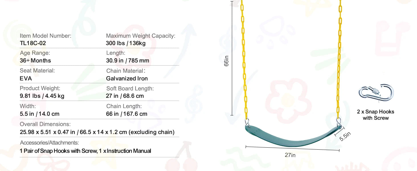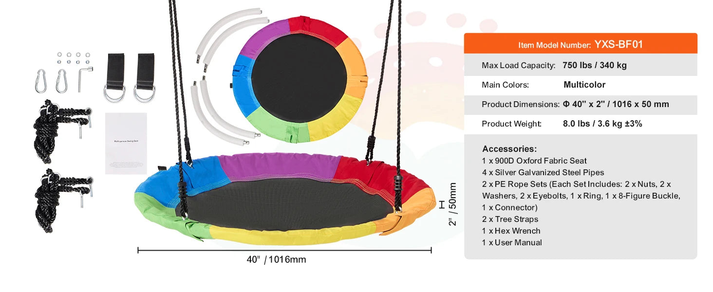 The base seat is crafted from 900D high-density nylon fabric, offering outstanding strength, water resistance, and color retention that won’t fade after seasons of play. The rainbow multicolor fabric adds a bright, cheerful touch to any outdoor space.