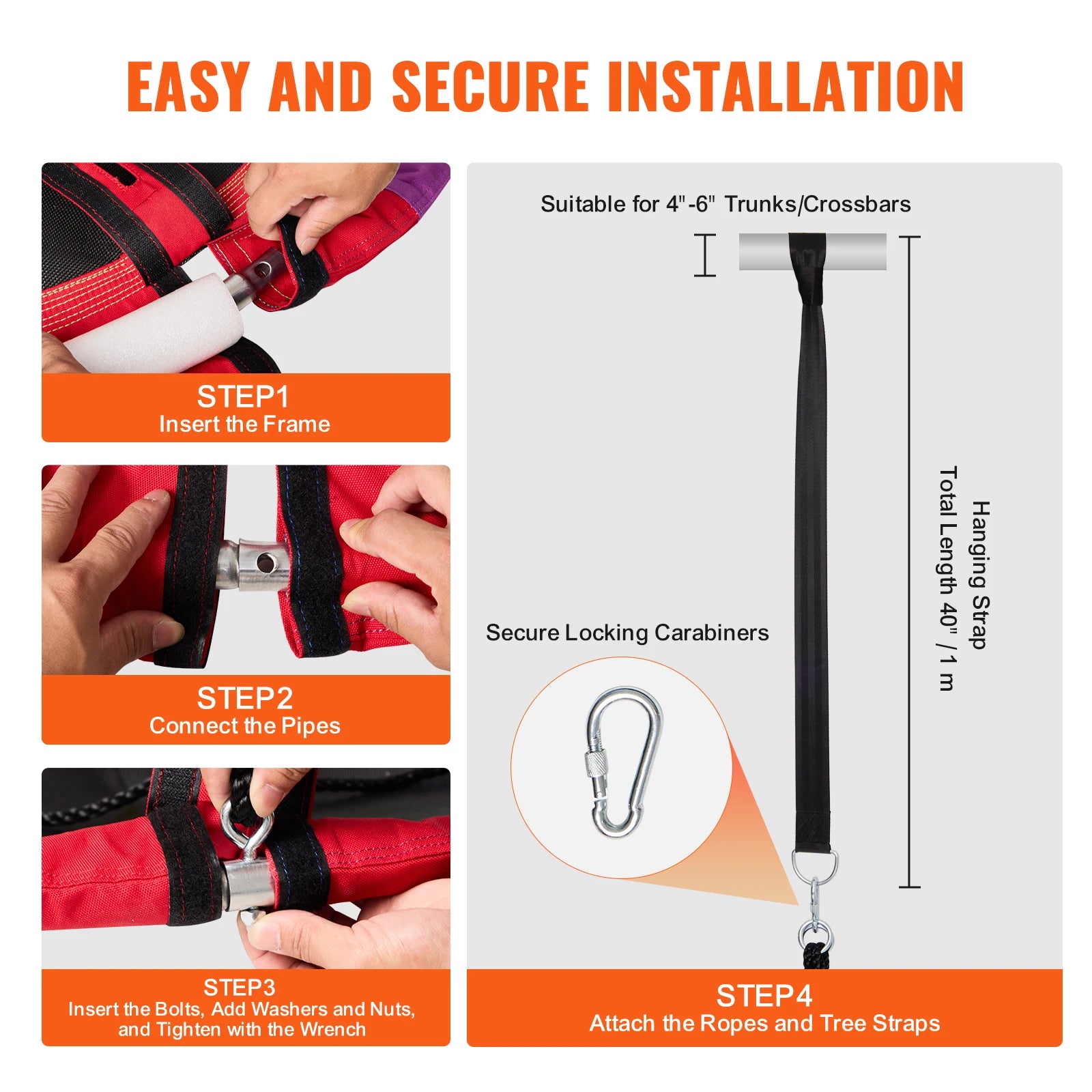 - Ready-to-hang included — two 39" (1 m) reinforced swing straps and heavy-duty galvanized locking carabiners are included for secure mounting on sturdy branches (4–6 inch diameter recommended).