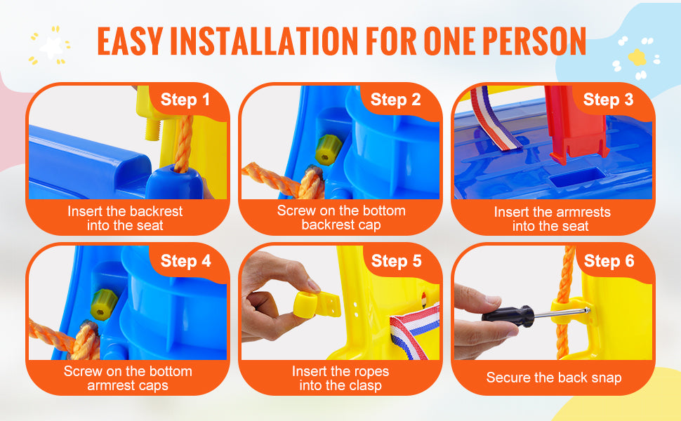 The SucceBuy Saucer Swing is a complete outdoor play solution. Its galvanized steel bolts resist rust, while the soft foam layer on the frame adds comfort and safety for little riders. The included accessories are ready to hang on a sturdy tree branch or an appropriate mounting point, making installation straightforward and stress-free.