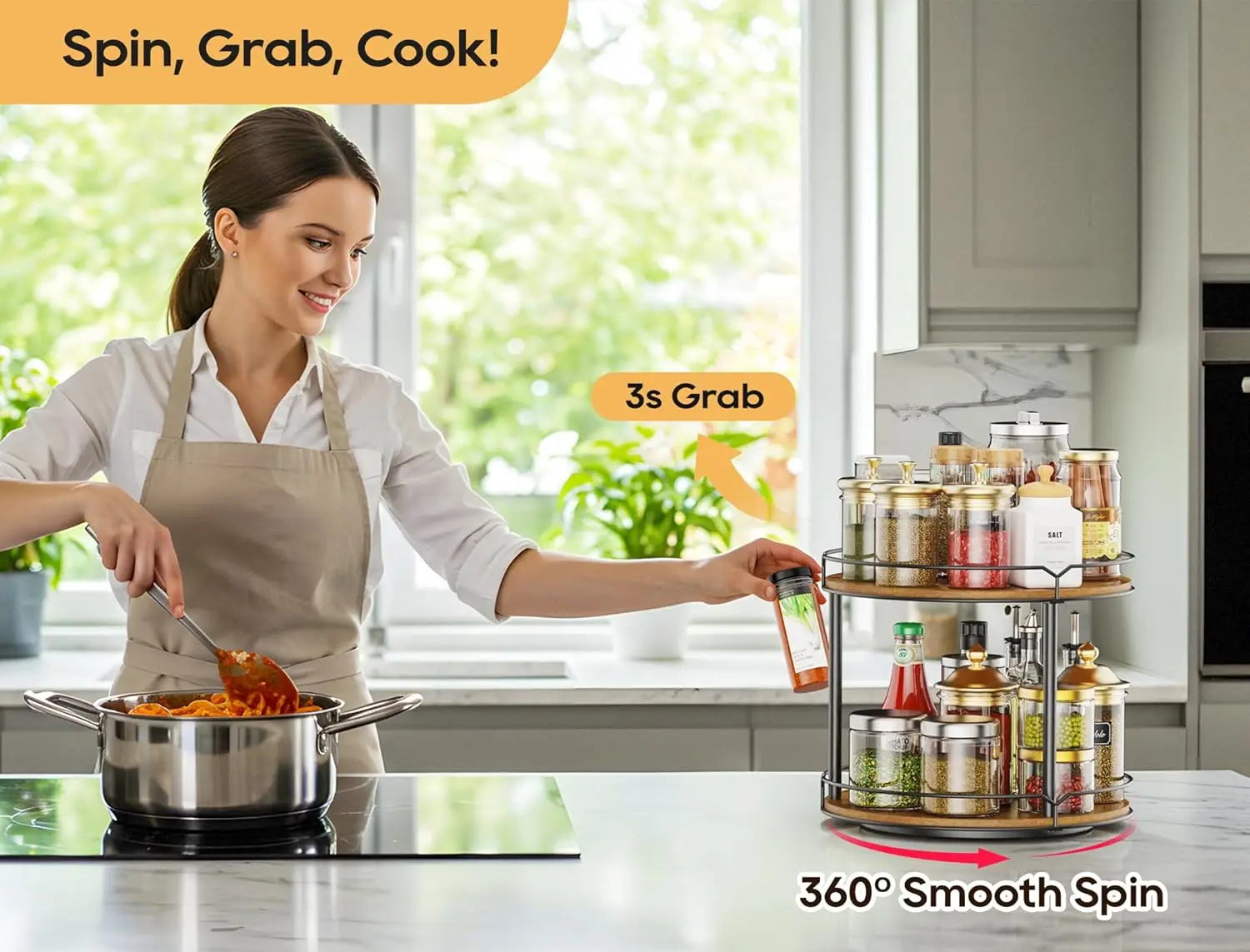- Triple-tier rotating design delivers three accessible levels for spices, toiletries, cosmetics, snacks, or craft supplies.