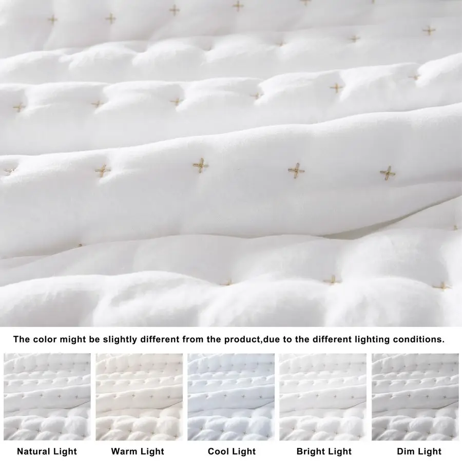 The White Queen Size Quilt Bedding Set with Pillow Shams delivers a serene, hotel-inspired look with practical everyday comfort. This set is designed to drape beautifully across a queen bed, pairing a quilt 90x90 with two pillow shams 20x26. The crisp white fabric is accented with subtle gold cross-stitching, creating a refined focal point that coordinates effortlessly with modern and classic bedroom styles.