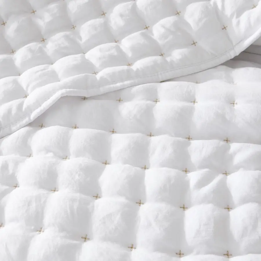 - Design: white quilt with delicate gold cross-stitching; subtle jacquard texture